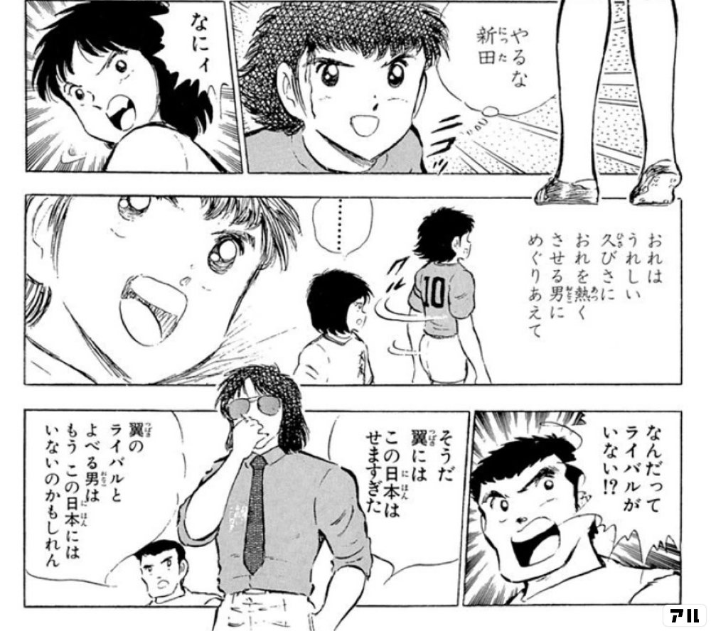 やるな新田 ニコッ なにィ おれはうれしい 久びさにおれを熱くさせる男にめぐりあえて なんだってライバルがいない そうだ翼には この日本はせますぎた 翼のライバルとよべる男は もうこの日本にはいないのかもしれん キャプテン翼 キャプ翼 アル